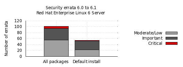 The chart below illustrates the total number of security updates issued for Red Hat Enterprise Linux 6 Server if you had installed 6.0, up to and including the 6.1 release, broken down by severity. It's split into two columns, one for the packages you'd get if you did a default install, and the other if you installed every single package (which is unlikely as it would involve a bit of manual effort to select every one). For a given installation, the number of package updates and vulnerabilities that affected you will depend on exactly what you have installed or removed.