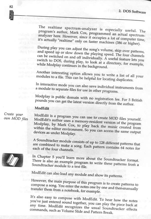 ModPlay was the first Protracker Module player that supported the PC speaker and soundcards other than the SoundBlaster. It let you play Amiga soundtracker, noisetracker, and protracker module files on a 10MHz 286 system or better. Modplay was written entirely in assembler code, running to over 11,000 lines of source code taking around 400 hours to produce. Modplay came with details and circuit diagrams for building parallel port DAC devices, amplifiers, and more. Although I didn't give out the source code, it was a completely freely distributable program.